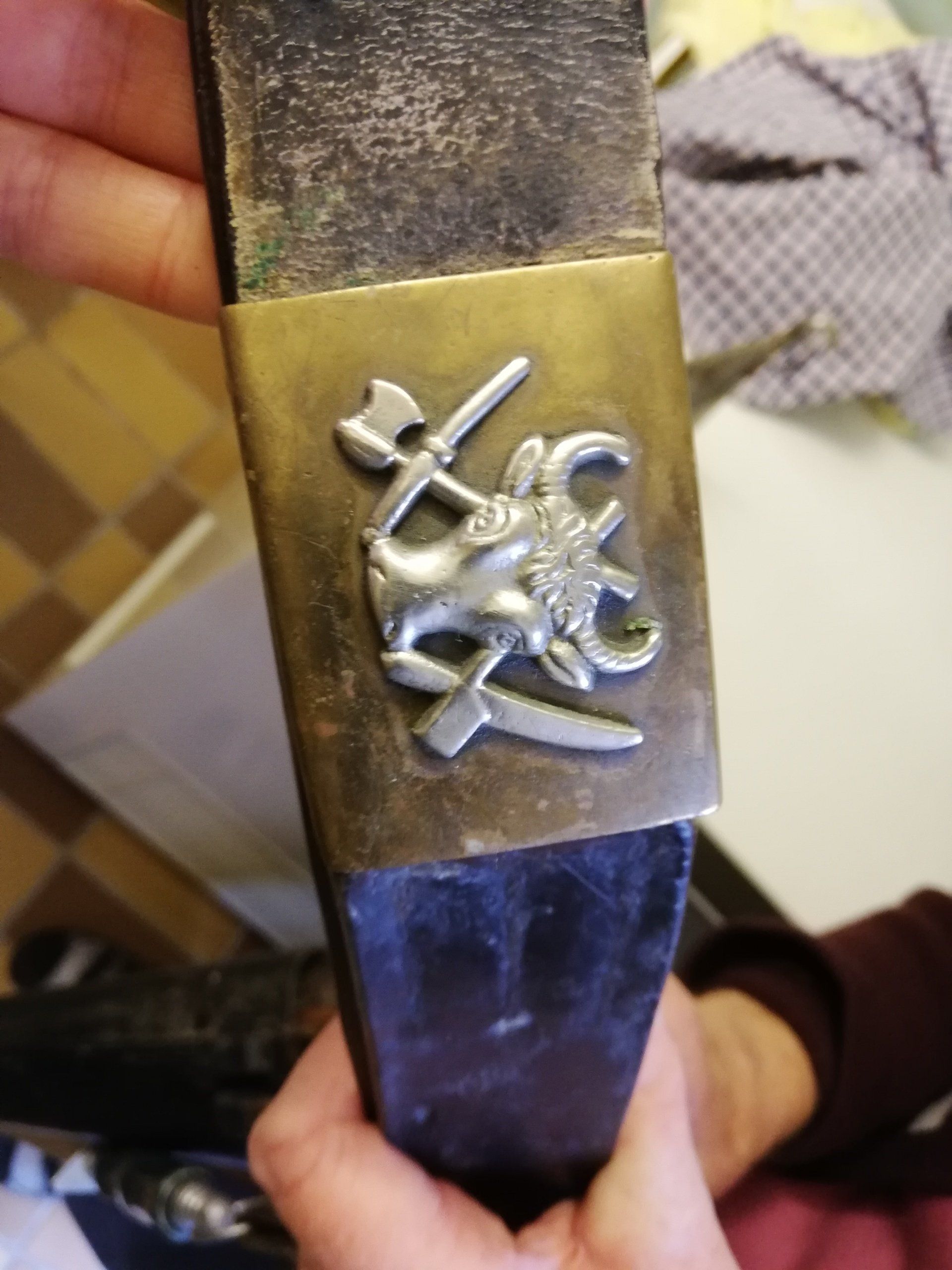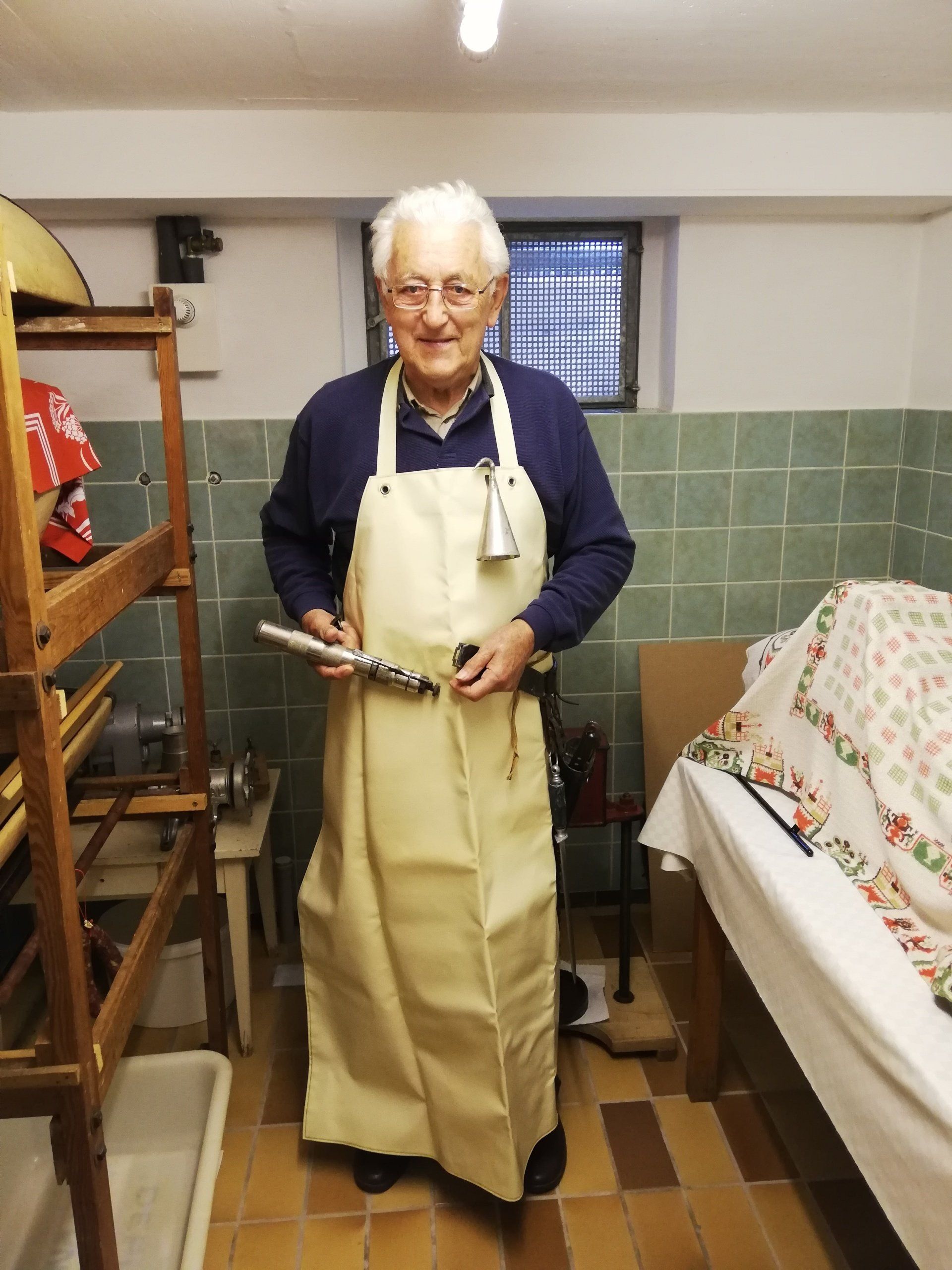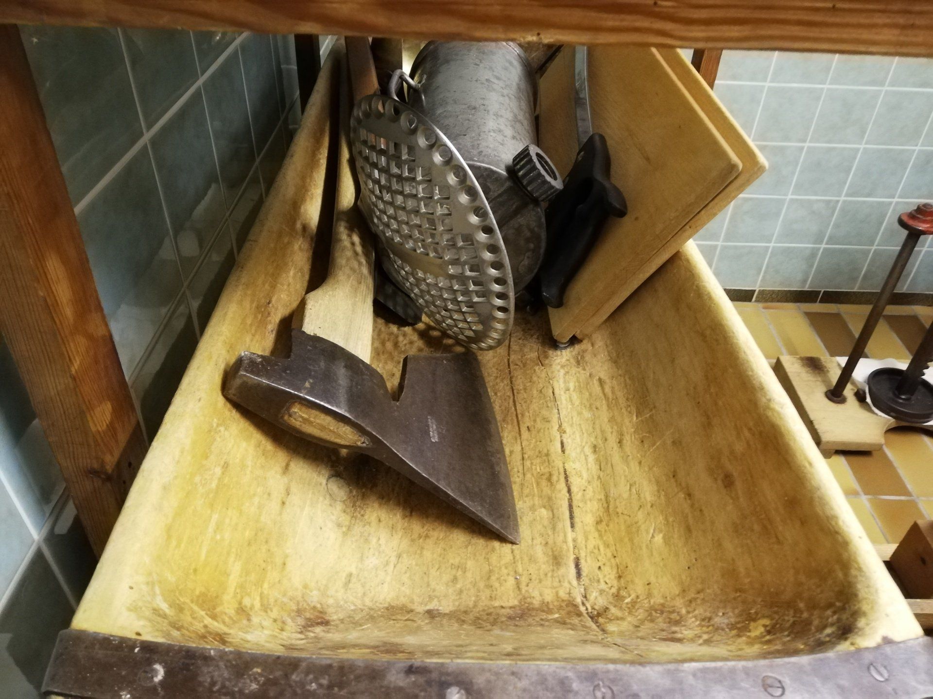 Zu seiner Ausrüstung gehörten der Holztrog, ein Schußapparat, Axt und Messer, ein Fleischwolf und eine Schabeglocke. Auf dem Bild sieht man Willi damals und heute in der Metzgerschürze und seinem Werkzeug.